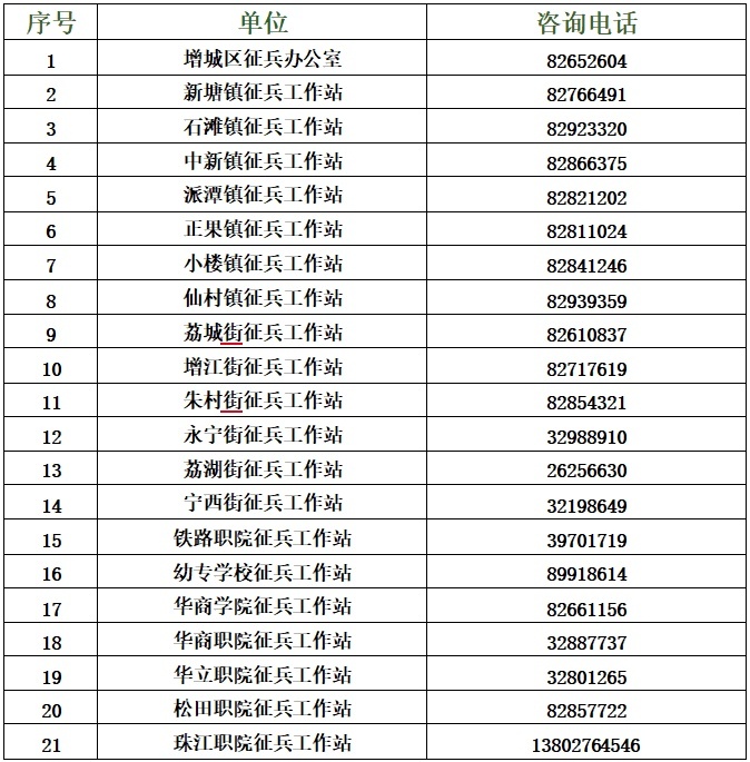 增城区各级征兵办公室咨询电话: